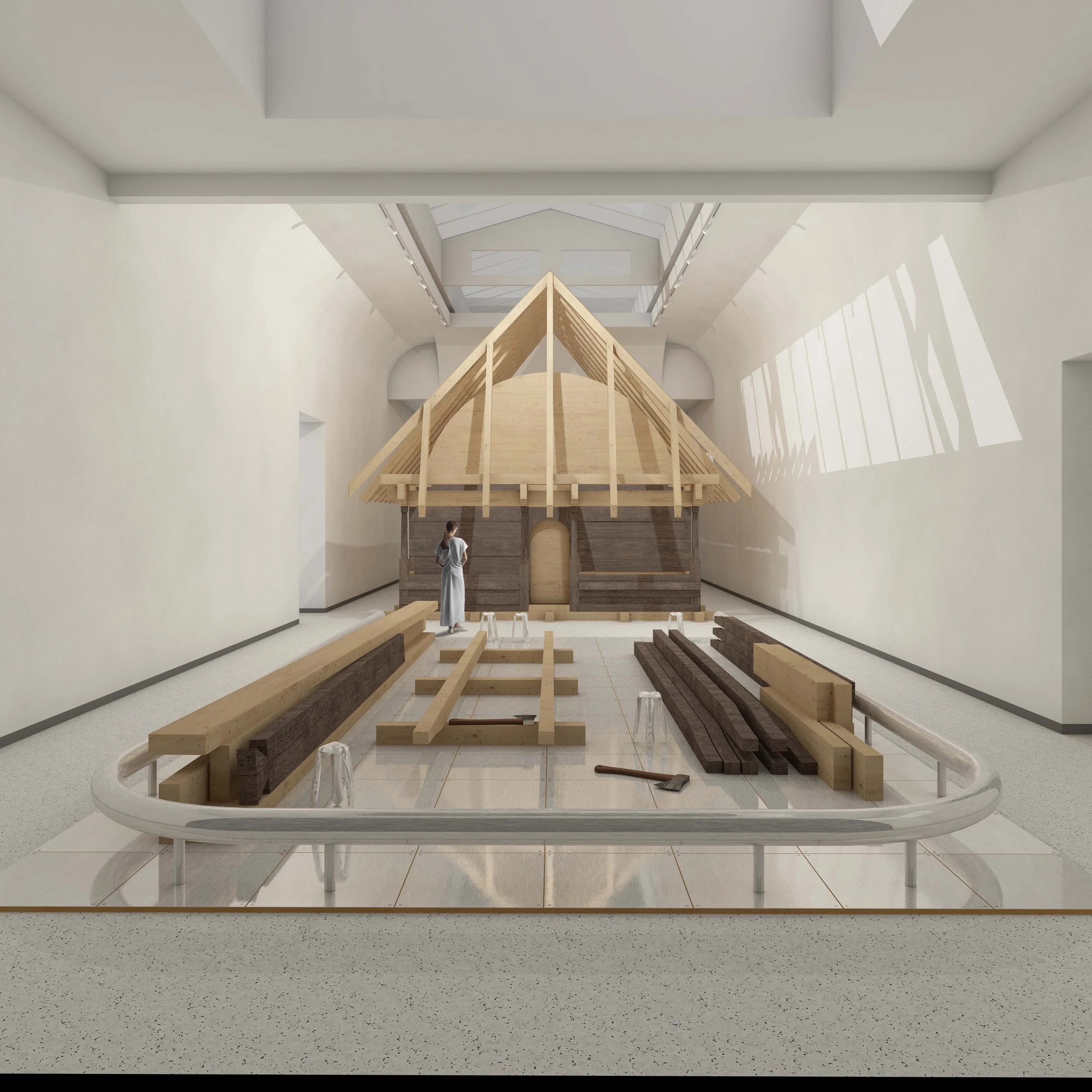 The Romanian Pavilion is imagined as a dynamic space: in the first months the church structure would be reassembled, while adjacent areas would host workshops and talks. The IRCCU Gallery would serve as a laboratory for the restoration of artistic components, evoking a contemporary ecclesiastical space.